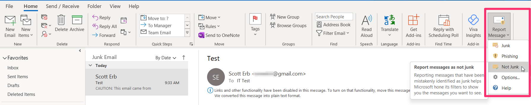 To report an email as not Junk in Outlook on Windows, click on the email you want to report; in this example, the email with subject Test. In the top right hand corner, click on Report Message and select Not Junk in the dropdown.