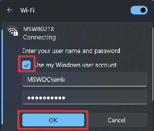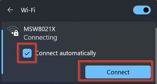 In the wireless window, click on MSW8021X, check the box for Connect automatically and click Connect.